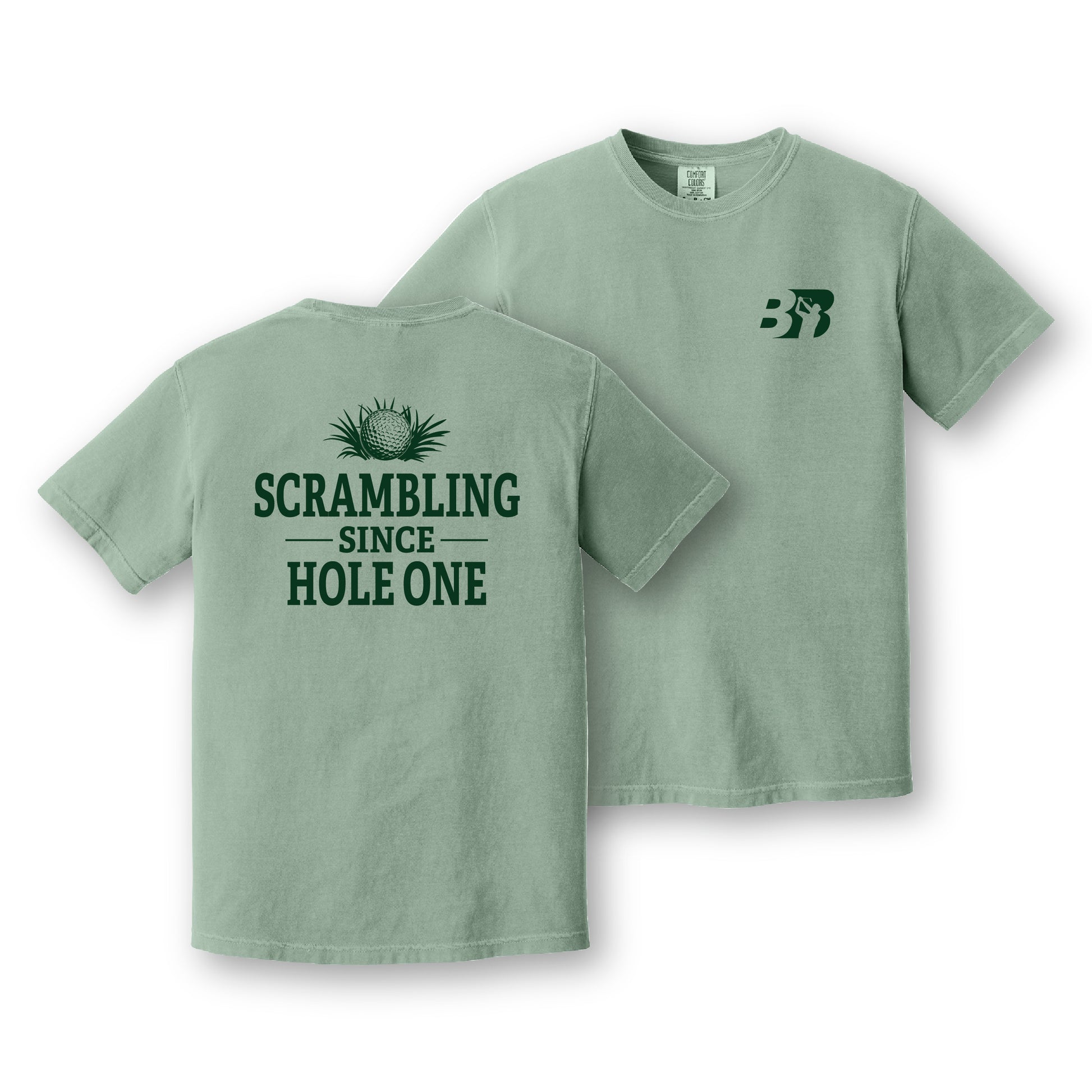 Signature Look: BB logo on the chest, bold “Scrambling Since Hole One” graphic on the back with a thistle design.